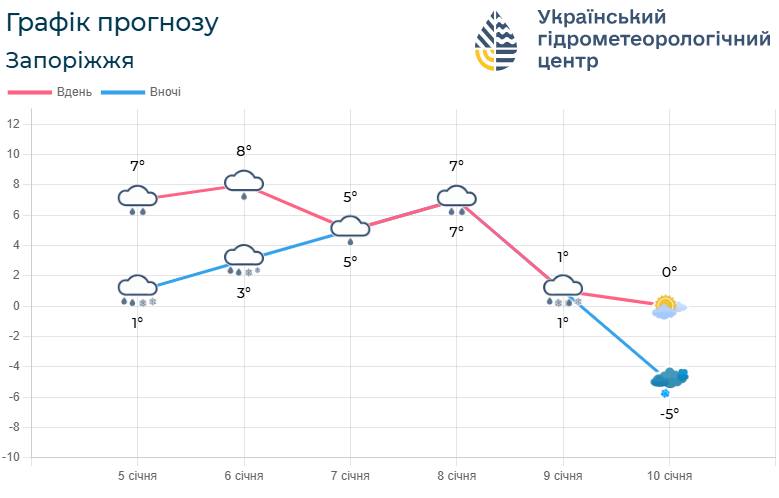 - 8 січня - вночі хмарно, мокрий сніг та дощ. Температура: +5°…+3°C. Вітер: Південно-Східний 7-12 м/с.