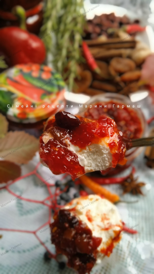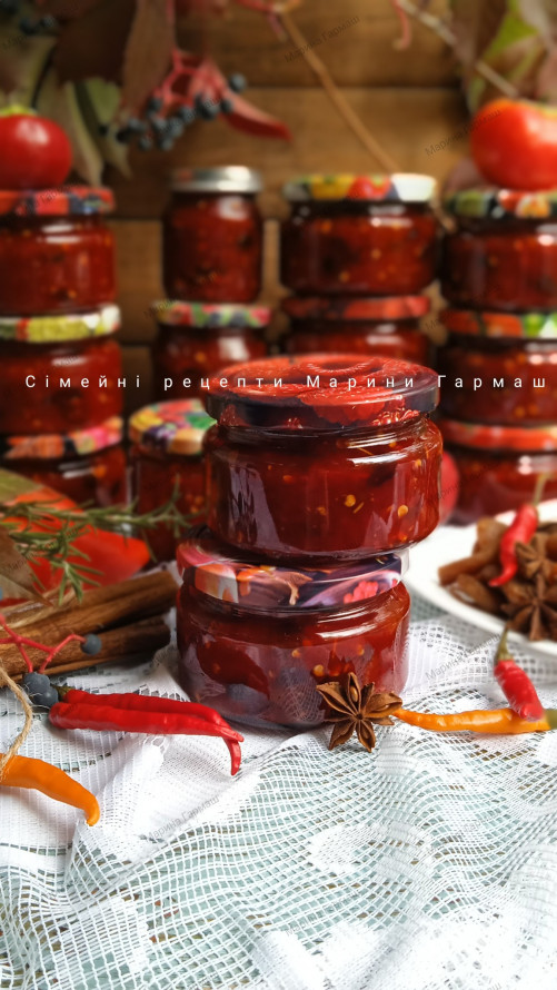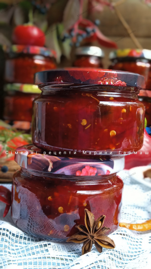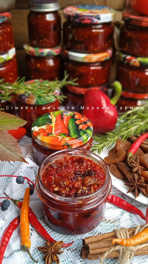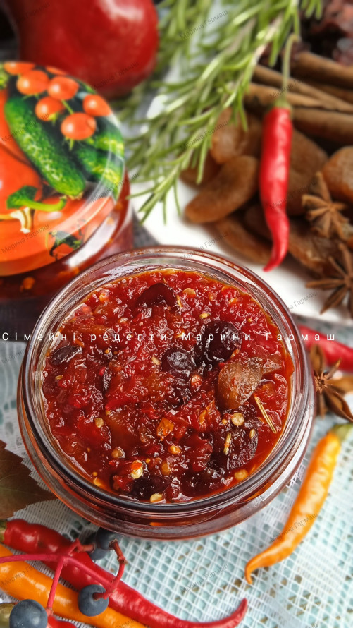 Потрібно: 1 кг солодкого перцю, 1 кг гострого перцю, 1, 5 кг цукру, 250 гр кураги, 150 гр інжиру, 250 гр журавлини, 300 мл яблучного оцту 6 %, 0, 5 ч. л. кориці, 1 ч. л. імбиру, 1 ч. л. розмарину.