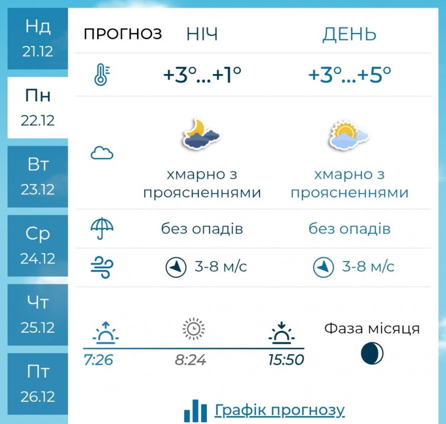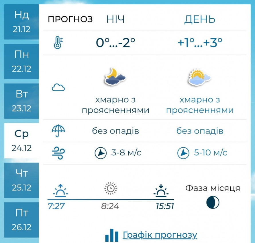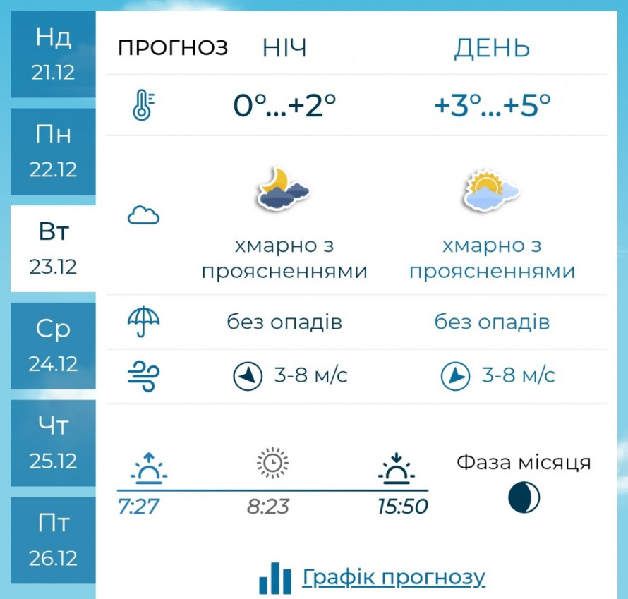 У вівторок, 23 грудня, другий робочий день тижня залишиться під владою хмарності. Похмура погода триматиметься до самого вечора, проте дощу чи снігу не передбачається.