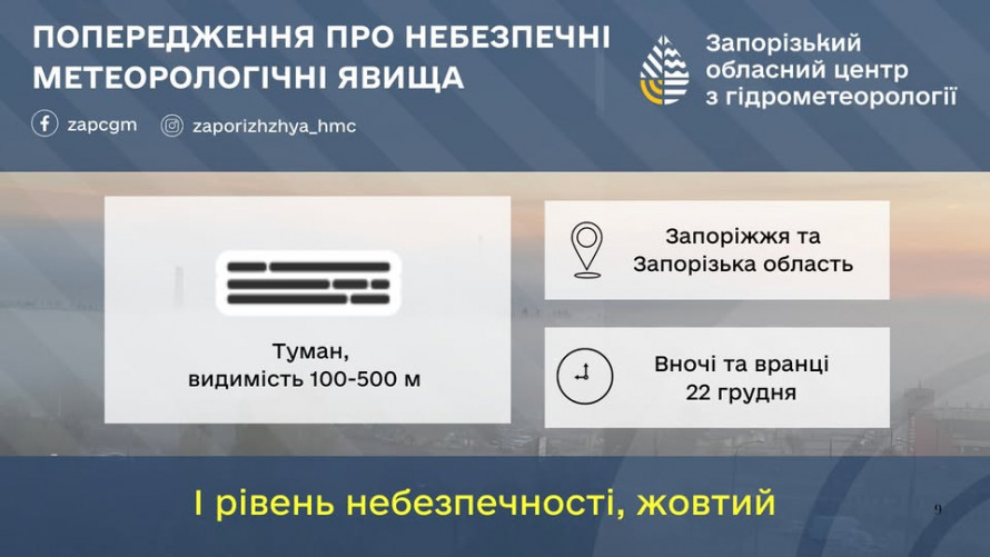 Український гідрометеорологічний центр оголосив жовтий рівень небезпечності у зв'язку з туманами. 22 грудня вночі та вранці у більшості західних, центральних та південних областей очікується туман з видимістю 200-500 метрів. Такі погодні умови можуть призвести до ускладнення руху транспорту на дорогах області.