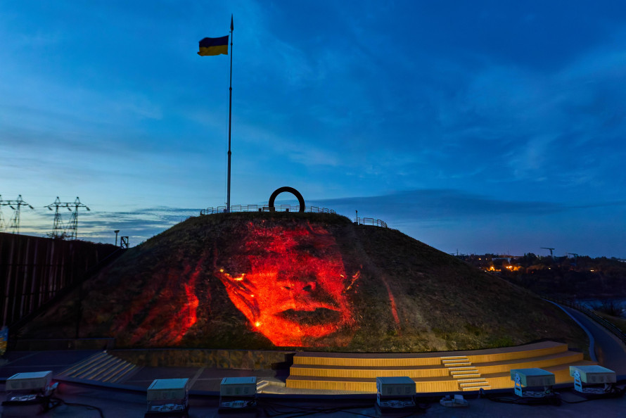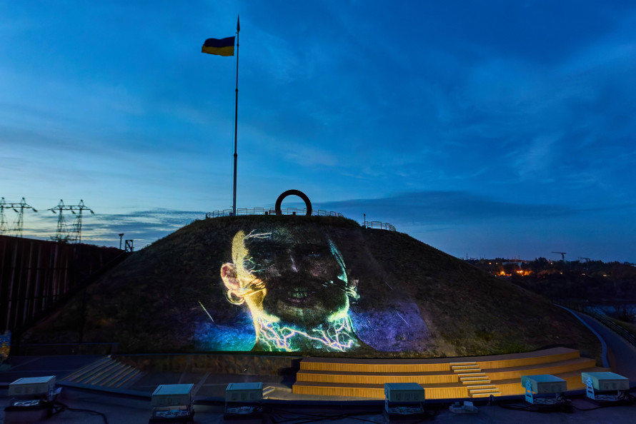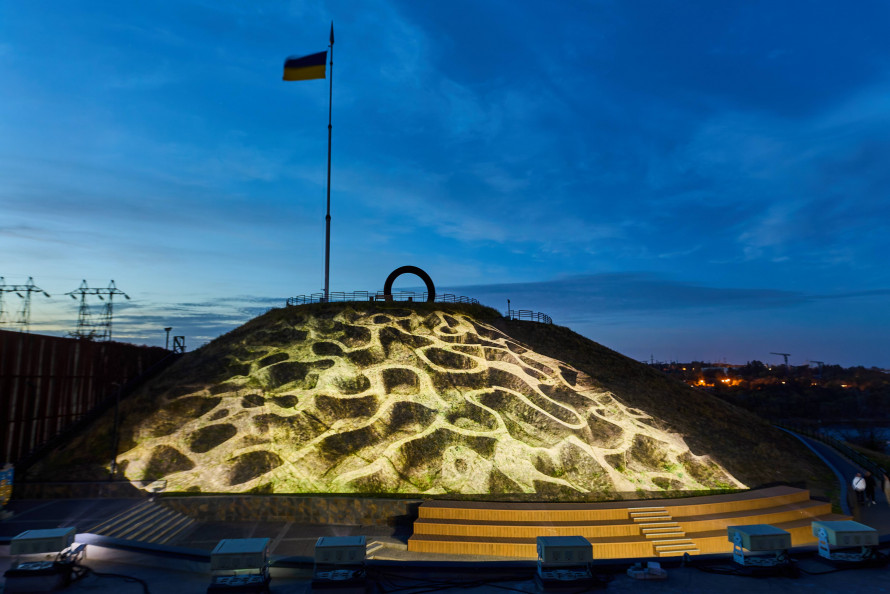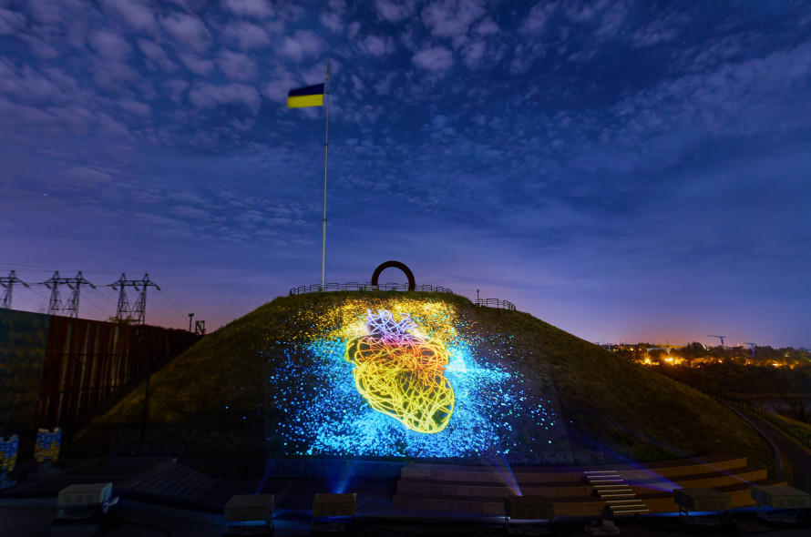 Світлова інсталяція органічно вписалася у природний ландшафт: курган, скелі та простір над Дніпром стали частиною художнього полотна.