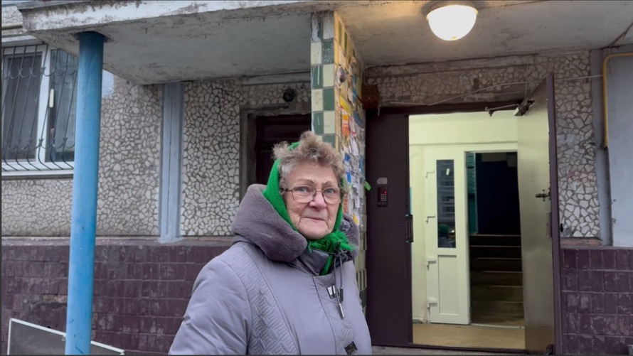 "Був свист, шалений грохіт — і все повилітало. Сусідка каже: "Біжи, тікай", встигла добігти лише до сьомого поверху. Був шалений грохіт, що ми там на сходах попадали. Перелякалася настільки, на стільки людина може перелякалися в 76 років. Чоловік кричить: "Заспокойся, заспокойся". На балконі жодного вікна нема і в залі жодного.
