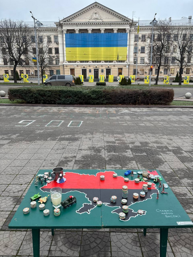 "Це вулична інсталяція про війну, у якій Україна стала гральним столом. Про рішення, що приймаються далеко від фронту. Про ставки, які вимірюються не фішками — а життями ", – повідомив Максим Кравчук.