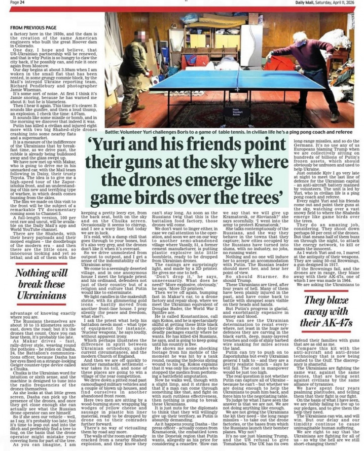 Зокрема, він згадав тренера з настільного тенісу Юрія, який уночі допомагає збивати дрони, та 24-річну офіцерку зв’язку Дашу з Краматорська, яка пішла до війська, щоб захистити рідне місто.