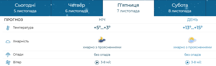 У п’ятницю, 7 листопада, ситуація залишиться подібною — хмарно з проясненнями, сухо та доволі тепло, як для початку листопада.