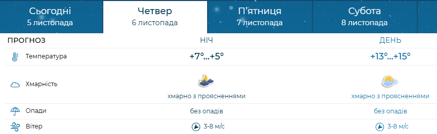 У четвер, 6 листопада, синоптики обіцяють хмарність із проясненнями та без опадів.