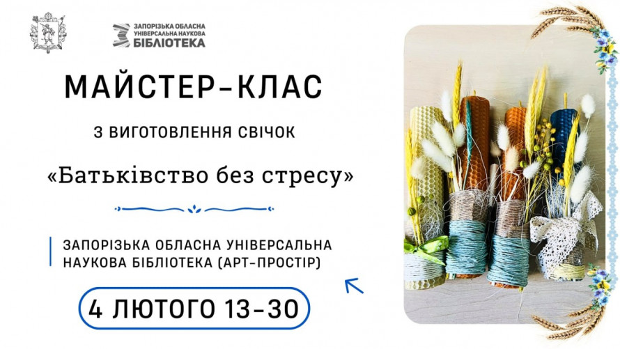 - 4 лютого 13.30 - майстер-клас з виготовлення свічок "Батьківство без стресу" від БФ "Посмішка ЮА", 18+. Матеріали надають організатори.