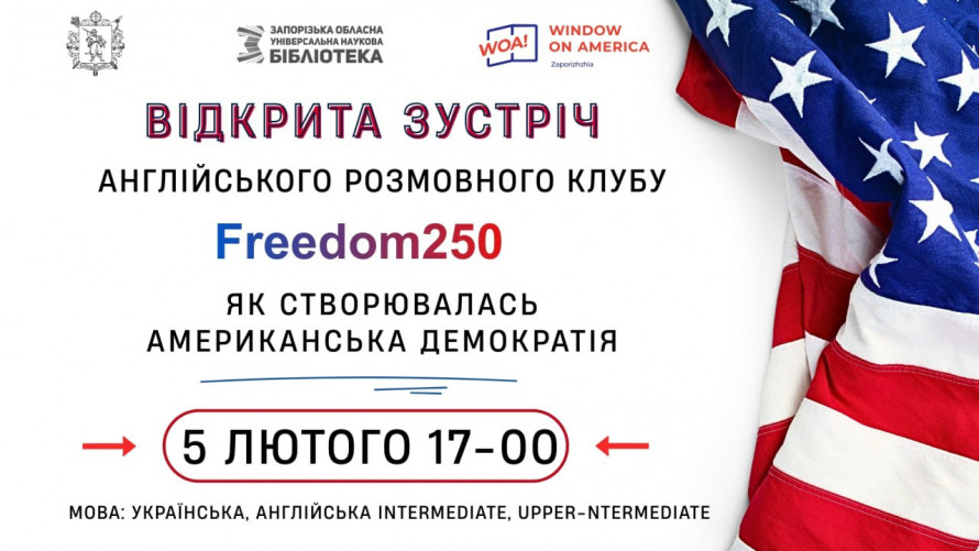 - 5 лютого о 17.00 - Центр "Вікно в Америку - Запоріжжя" запрошує на першу зустріч Англійського розмовного клубу в межах програми Freedom 250. Ведуча - філологиня і перекладачка учасниця міжнародної програми AIESEC (University of North Dakota, США) Юлія Мітюшина.
