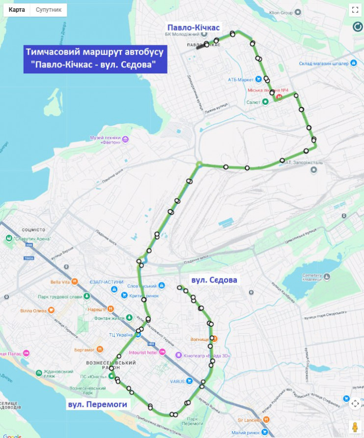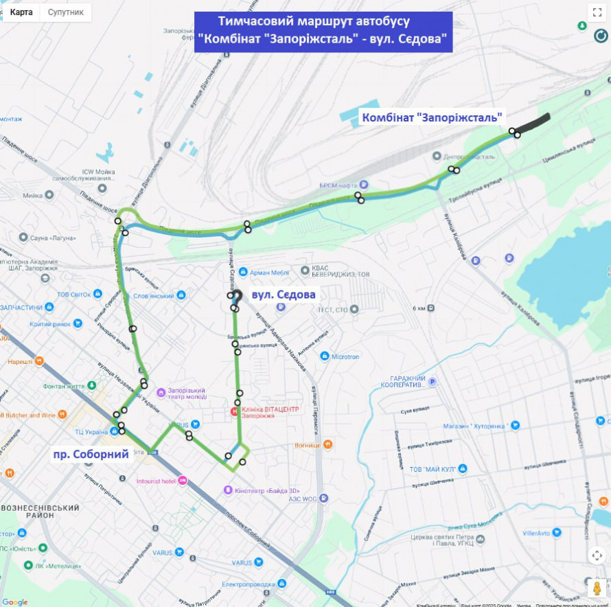 - додатковий автобус "Комбінат "Запоріжсталь" - вулиця Сєдова" за напрямком: Комбінат “Запоріжсталь” - Південне шосе - вулиця Діагональна - вулиця Вячеслава Зайцева - проспект Соборний — вулиця Якова Новицького - вулиця Сєдова;