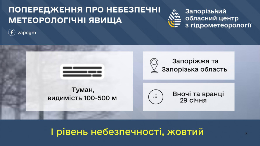 Запорізький обласний центр з гідрометеорології попередив на своїй офіційній сторінці у фейсбуці про небезпечні метеорологічні явища у Запоріжжі та області завтра, 29 січня.