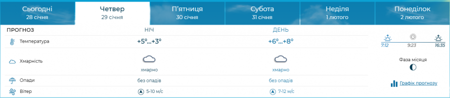 - 29 січня - вночі за прогнозом буде хмарно, без опадів. Температура: +5°…+3°C. Вітер: Південний 5-10 м/с.