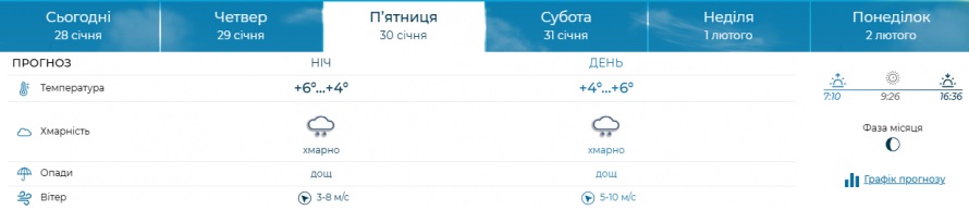 - 30 січня - вночі буде хмарно, дощ. Температура: +6°…+4°C. Вітер: Південно-Східний 3-8 м/с.