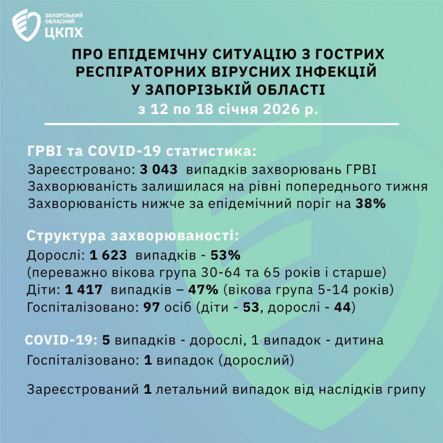 У Запорізькій області зафіксовано один летальний випадок від ускладнень грипу. Про це повідомили в Запорізькому обласному центрі контролю та профілактики хвороб за підсумками моніторингу епідемічної ситуації з гострих респіраторних вірусних інфекцій, зокрема COVID-19, за період з 12 по 18 січня 2026 року.