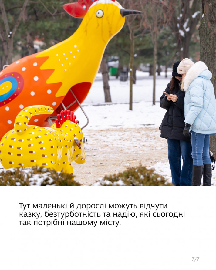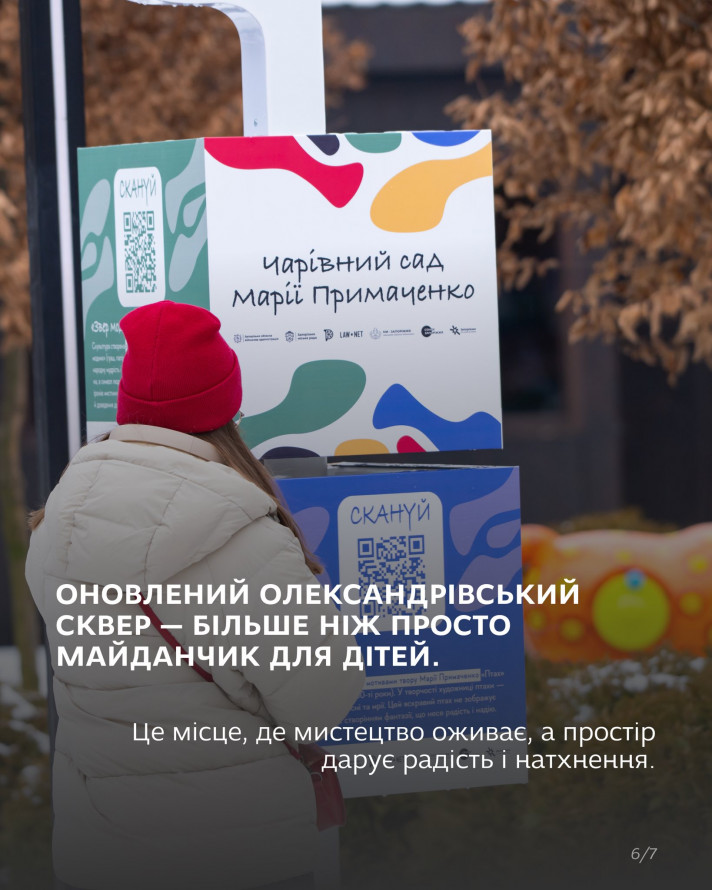 Олександрівський сквер змінився - тепер це не просто місце для прогулянок, а справжній острівець затишку і краси серед міста. Сучасний дитячий майданчик, зручні доріжки та доглянуті зелені зони чекають на гостей. До Нового року тут прикрасили ялинку, шо росте у сквері. Але головна родзинка оновлення - "Чарівний сад Марії Примаченко". Про відкриття повідомили на сторінці департаменту культури і туризму у фейсбуці та про сквер.