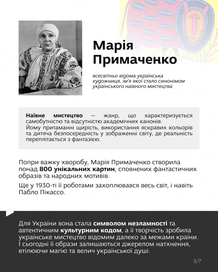 Марія Примаченко - особлива для України художниця, працювала у стилі наїв. Її знають у всьому цивілізованому світі. Малюнками Приймаченко захоплювався сам Пабло Пікассо. На мій погляд, її роботи – це своєрідний візуальний вираз чи втілення української душі.