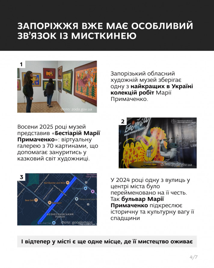 Запорізький обласний художній музей зумів зібрати одну з найкращих в Україні колекцій робіт Марії Примаченко - 100 чудових розписів. Наразі вона в тимчасовій евакуації. Виставку Марії Примаченко з колекції Запорізького обласного художнього музею у 2024 і 2025 роках показували у Литві.