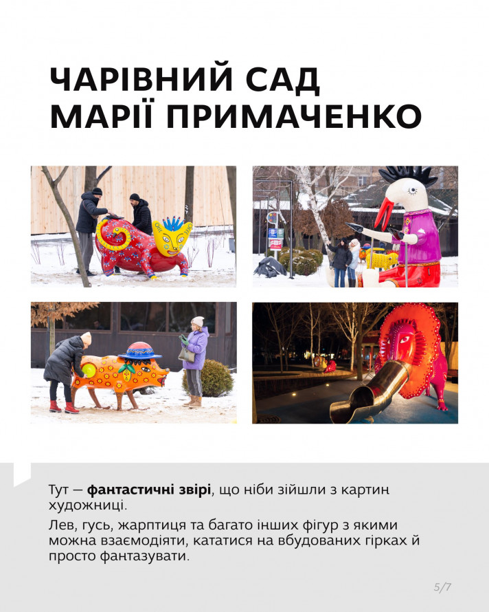 У парку також можна прочитати, на основі яких розписів Марії Примачнко зроблені фігури фантастичних звірів.