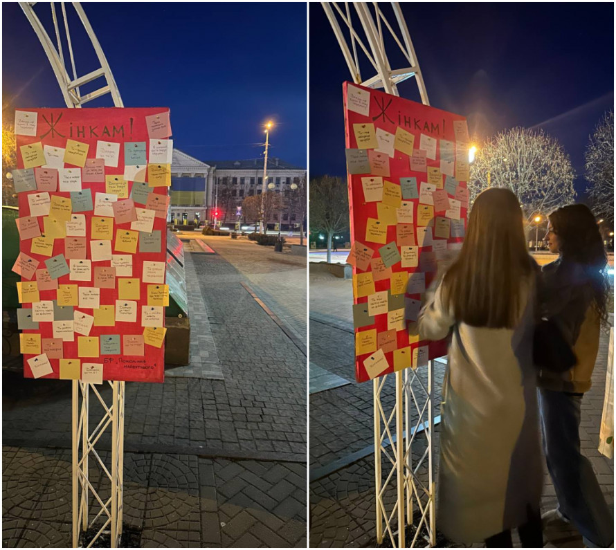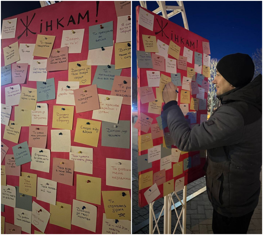 «Сьогодні у центрі міста з’явилася невелика інтерактивна інсталяція, присвячена жінкам. На ній — десятки коротких повідомлень від чоловіків: про силу, ніжність, підтримку, віру та тепло. Кожен стікер — це маленьке «дякую». І будь-який з них можна забрати собі на пам’ять.