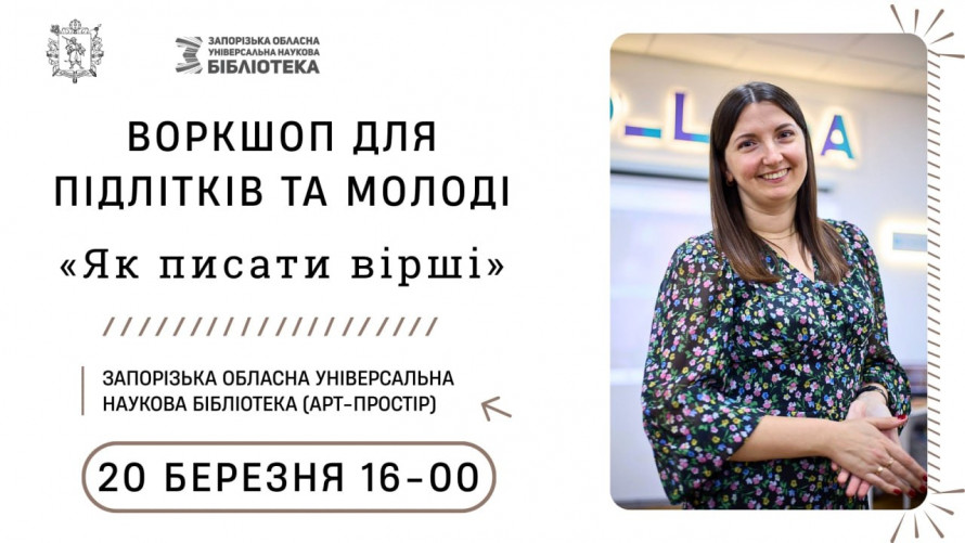 Також 20 березня, вже о 16.00, у межах Національного тижня читання поезії обласна універсальна наукова бібліотека запрошує підлітків та молодь на воркшоп "Як писати вірші" від поетеси, засновниці проєкту "Літературна штольня" Олени Ольшанської: