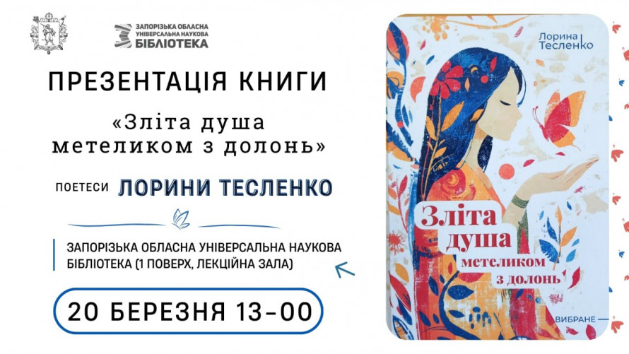 20 березня о 13.00 у Запорізькій обласній універсальній науковій бібліотеці (просп. Соборний, 142) відбудеться презентація поетичної книги "Зліта душа метеликом з долонь" членкині Національної спілки письменників України, керівниці Запорізького літературно-художнього об'єднання "Пошук" імені Лиходіда Лорини Тесленко. Про це повідомили у телеграм-каналі "Афіша ЗОУНБ".