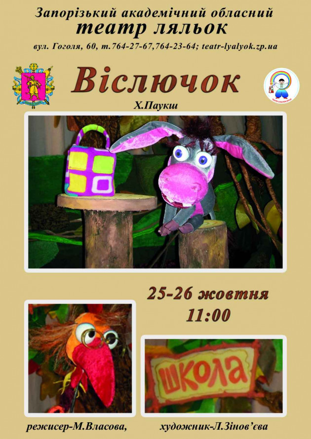 У найближчі вихідні, 25 і 26 жовтня, в Запорізькому академічному театрі ляльок відбудеться прем'єра оновленої вистави "Віслючок" за п`єсою латвійського драматурга Херманіса Паукша у постановці режисерки Марічки Власової. Це добра та кумедна казочка про важливість навчання.