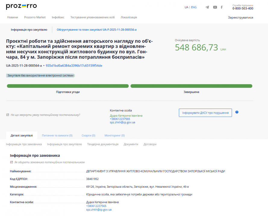 Департамент з управління ЖКГ Запорізької міськради уклав договір із ТОВ "УКРБУДПРОЕКТ" на розробку проєктно-кошторисної документації. Вартість робіт становить понад 550 тис. грн. Підрядник також здійснюватиме авторський нагляд — тобто контролюватиме відповідність ремонту затвердженому проєкту на всіх етапах.
