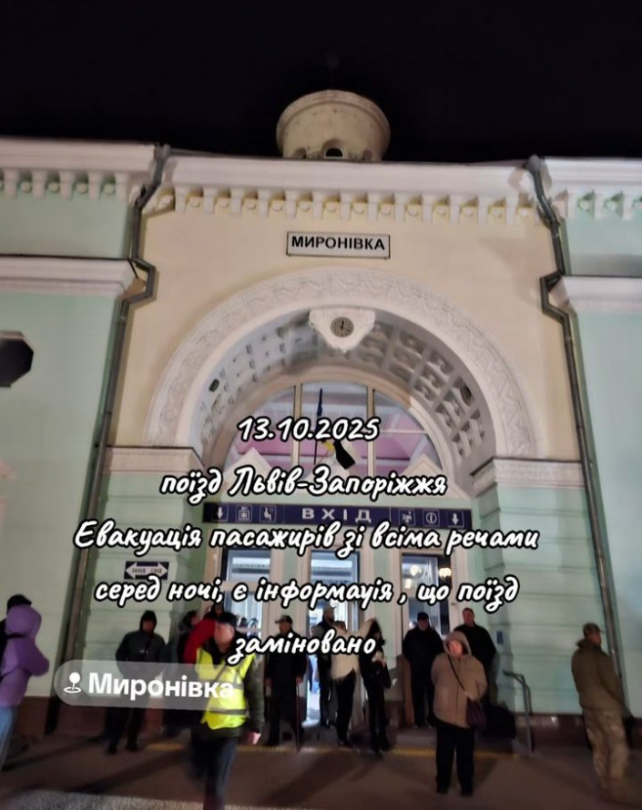 Вночі 13 жовтня на залізничній станції Миронівка пасажирський потяг “Львів–Запоріжжя” затримали через повідомлення про можливе замінування.