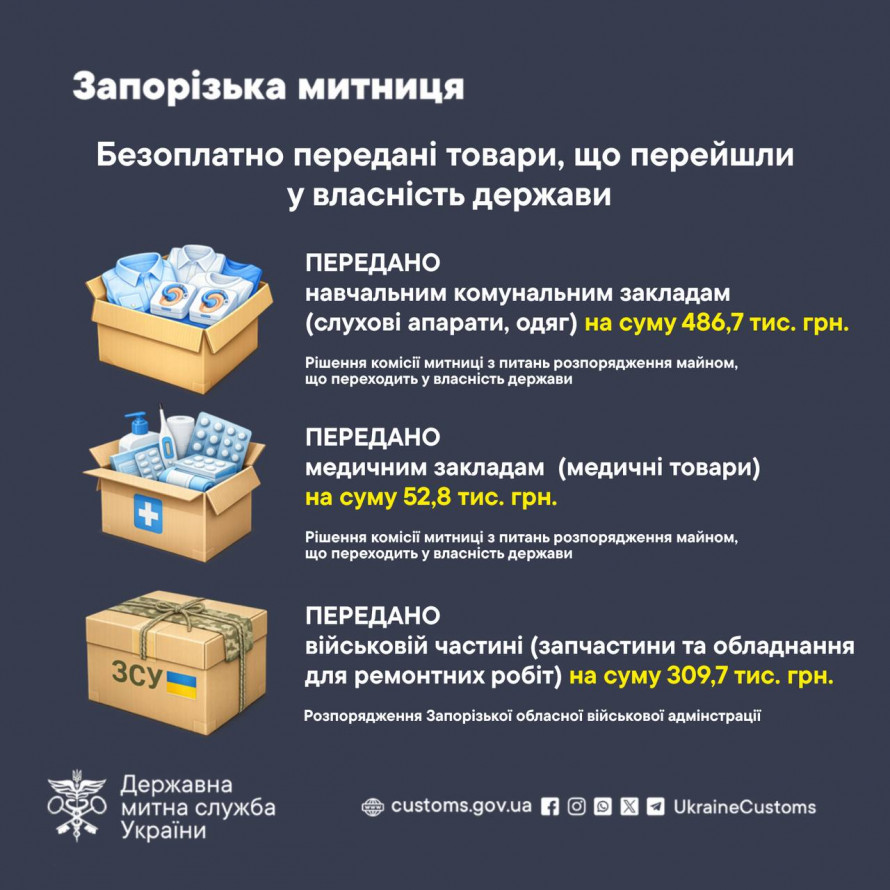 Упродовж 2025 року Запорізька митниця передала та реалізувала майно, яке перейшло у власність держави. Частина цих товарів пішла на потреби навчальних закладів, лікарень і військових, інше — продали на відкритих аукціонах, поповнивши бюджет.