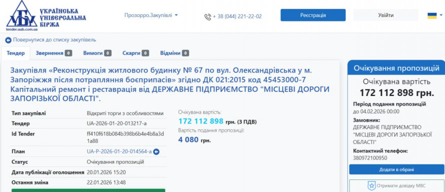 Замовником робіт виступає державне підприємство «Місцеві дороги Запорізької області». Тендер на виконання робіт уже опублікували на електронному майданчику «Української універсальної біржі».