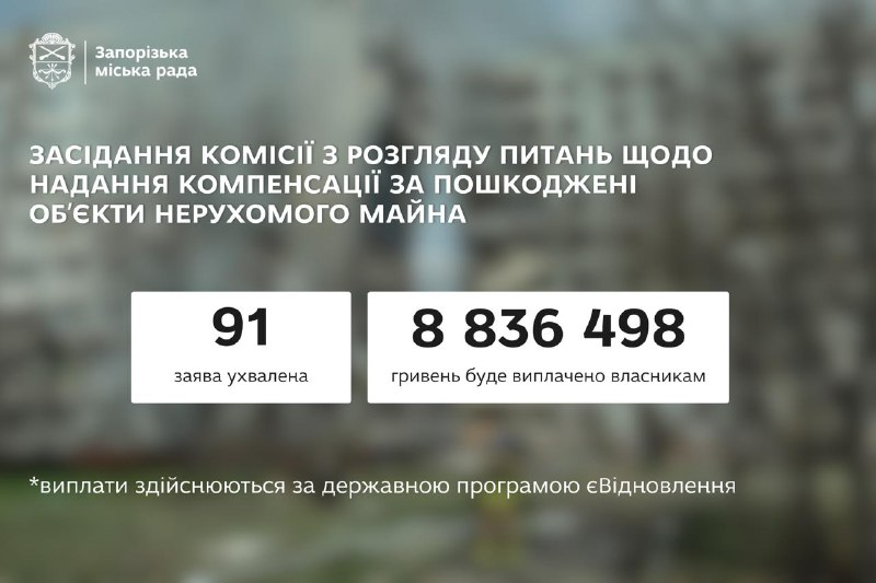 Засідання пройшло у четвер, 19 лютого. Під час розгляду заяв члени комісії погодили надання компенсації ще 91 запоріжцю. Загальна сума, яку отримають ці мешканці, становить 8 мільйонів 836 тисяч 498 гривень.