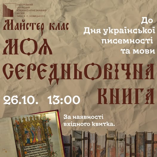 - 26 жовтня о 13.00 - майстер-клас "Моя середньовічна книга" до Дня української писемності та мови. Дізнайтеся, як створювали книги у добу середньовіччя, спробуйте себе у ролі переписувача та художника старовинного манускрипту. Необхідно придбати тільки вхідний квиток.