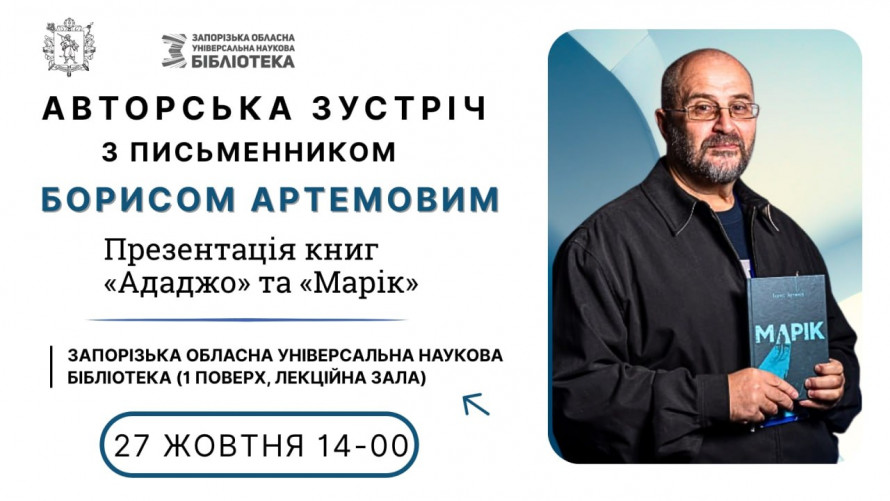 - 27 жовтня о 14.00 - аорська зустріч із запорізьким письменником Борисом Артемовим.