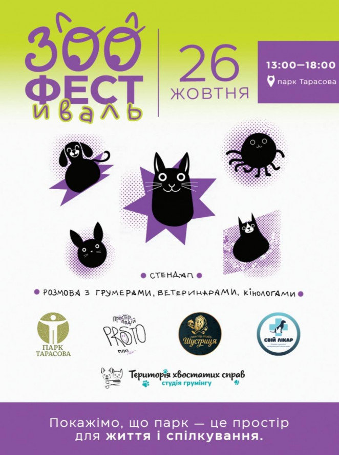 У зоні сцени протягом дня проходитимуть розмови з грумером, ветеринаром, кінологом, блогером і керівником притулку. Фінальний акорд - стендап-вечір від Простору подій “PROSTO” про тваринок.