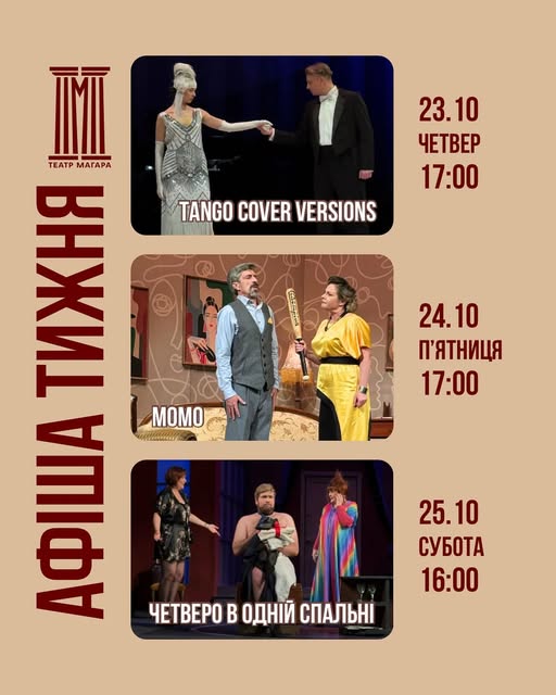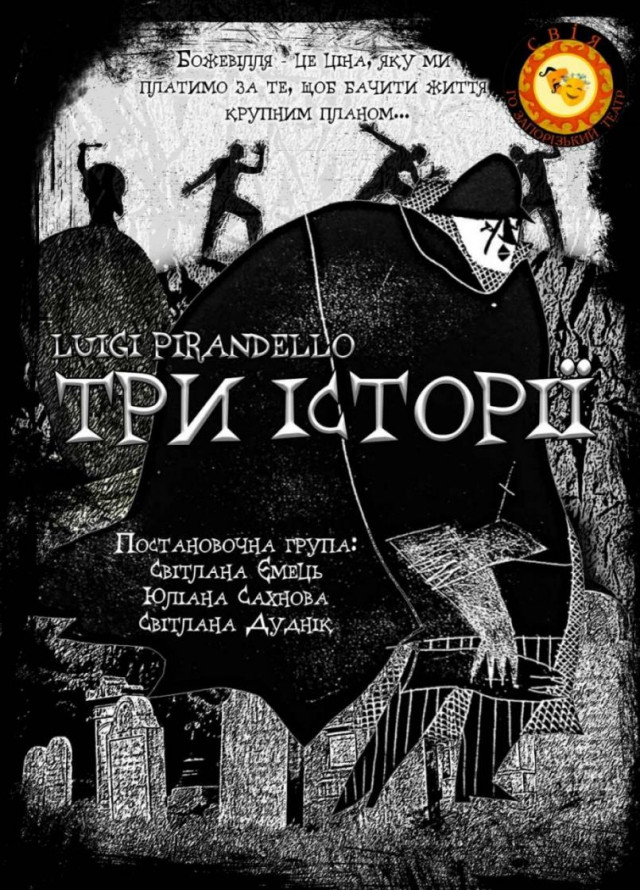 - 26 жовтня о 16.00 - вистава "Три історії" за оповіданнями італійського письменника і драматурга Луїджі Піранделло. 10+.