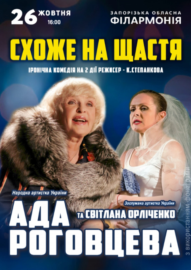 - 26 жовтня о 16.00 - іронічна комедія "Схоже на щастя" за участі Ади Роговцевої.