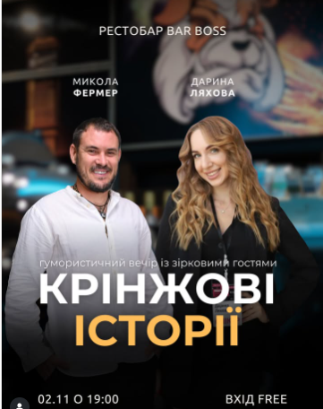 - 2 листопада о 19.00 - гумористичний вечір з зірковими гостями "Крінжові історії" (Микола Фермер, Дарина Ляхова).