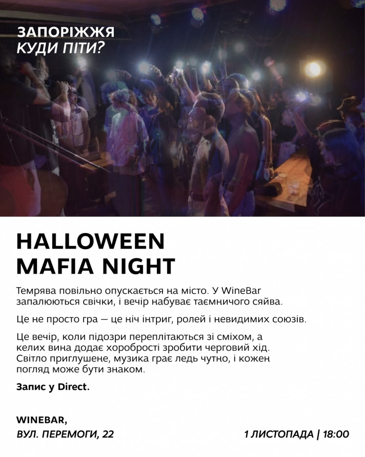 - 1 листопада о 18.00 - Halloween Mafia Night у WineBar.