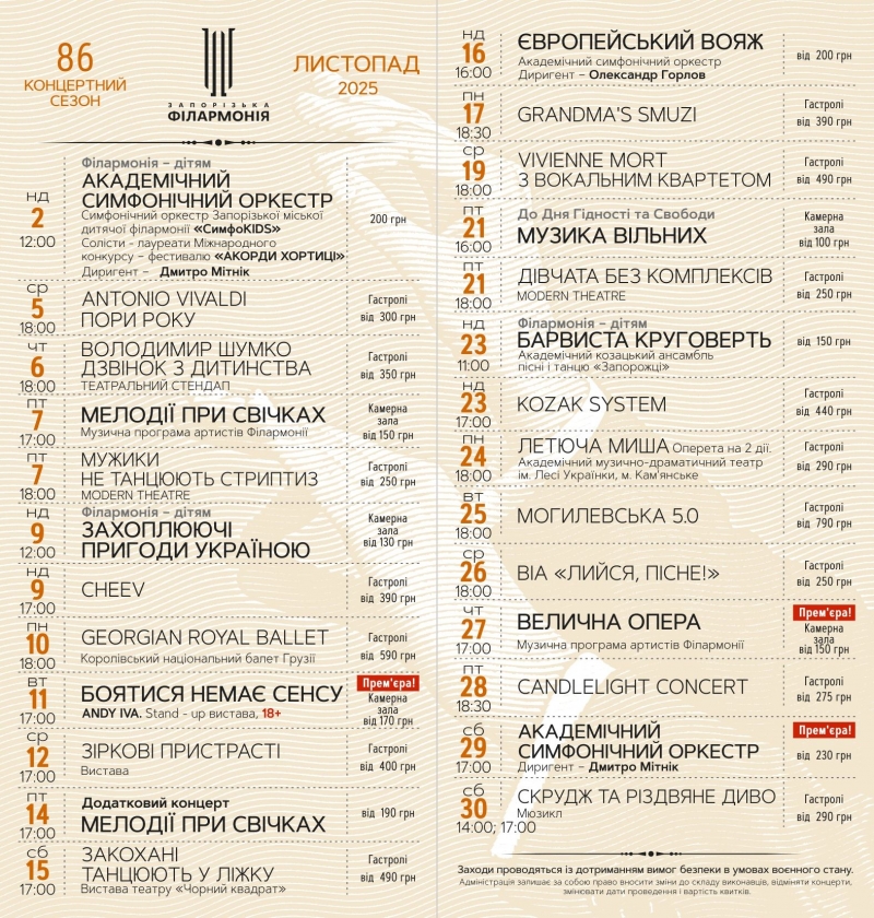 - 30 жовтня о 17.00 - концерт артистів філармонії "Вечір українського романсу" (в Камерній залі) перенесений на 7 листопада. Придбані квитки дійсні.