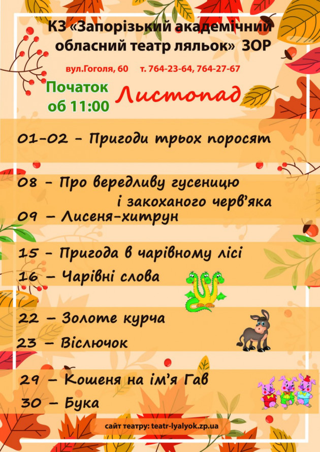 - 1, 2 листопада об 11.00 - казка "Пригоди трьох поросят".