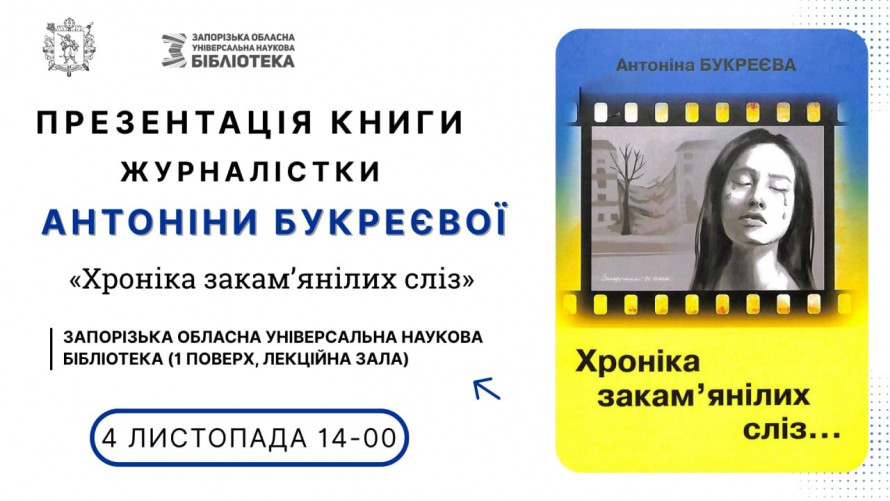 - 4 листопада о 14.00 - презентація книги журналістки Антоніни Букреєвої "Хроніка закам’янілих сліз". Реальні історії внутрішньо переміщених осіб та тих, хто залишився в окупації.