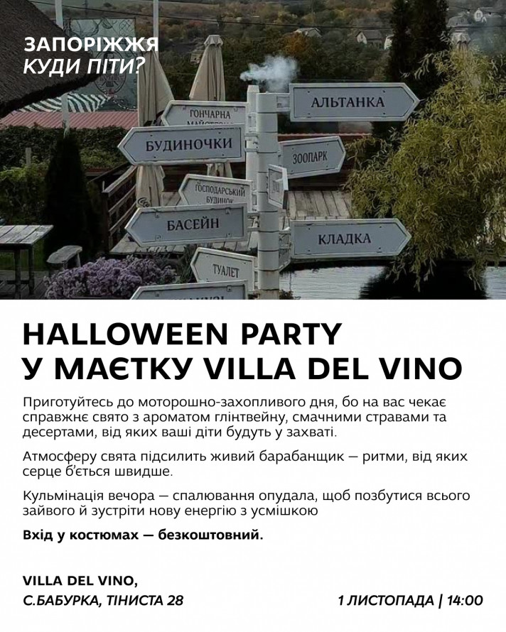 - 1 листопада з 14.00 - Halloween у маєтоку Villa Del Vino (с. Бабурка, Запорізький район). О 14.00 стартує дитячий квест.