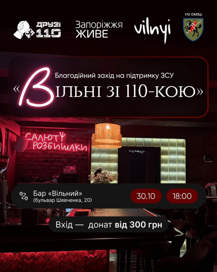 - 30 жовтня о 18.00 - благодійний вечір “Вільні зі 110-кою” на підтримку 110 ОМБр, у барі "Вільний". Сет від діджея для атмосфери, благодійний аукціон, ярмарок на терасі, коктейлі.