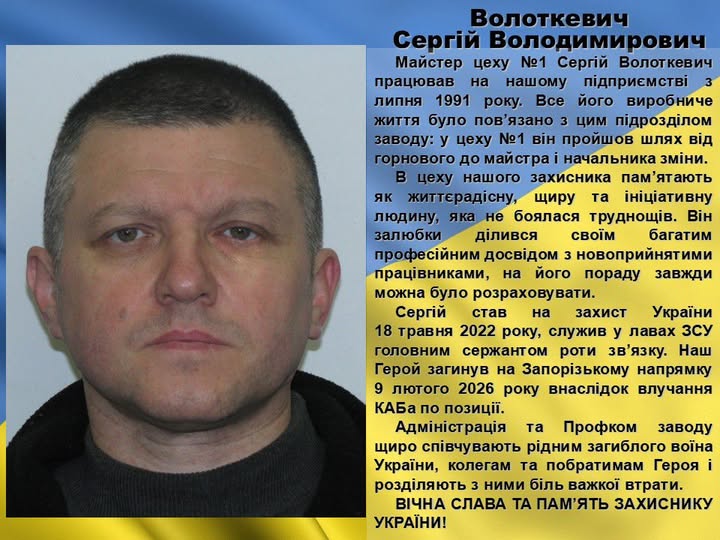 У Запоріжжі назавжди попрощалися з Героєм — Сергієм Волоткевичем, який працював майстром цеху №1 на АТ «Запорізький Завод Феросплавів». Захисник загинув 9 лютого 2026 року на Запорізькому напрямку — ворожа керована авіабомба влучила прямо в позицію, де він перебував.