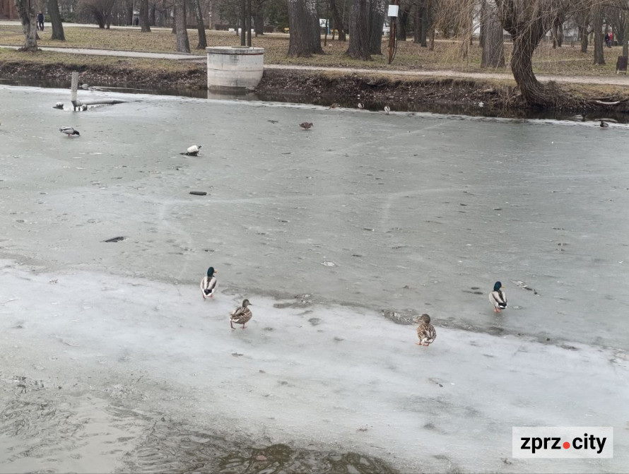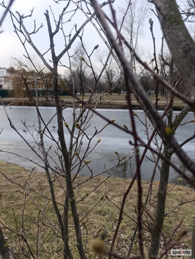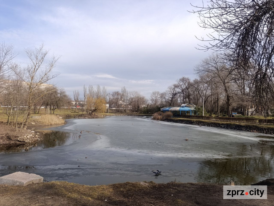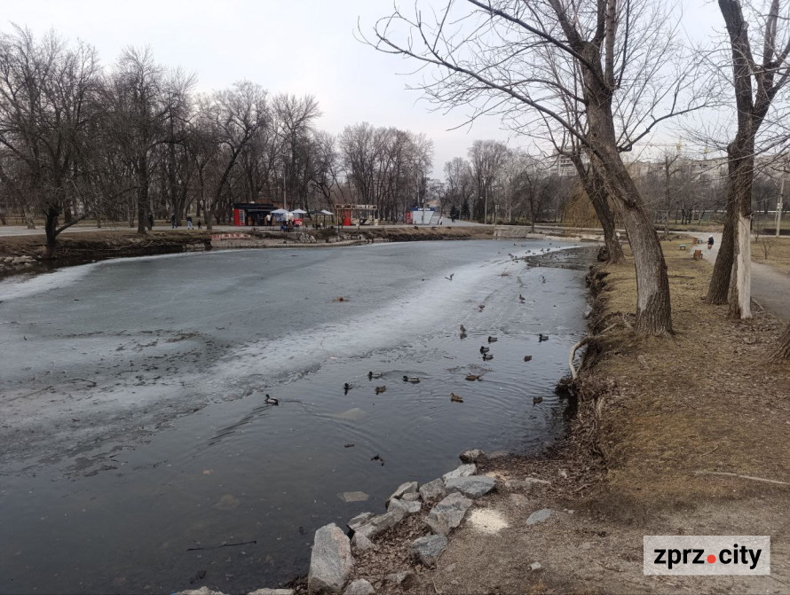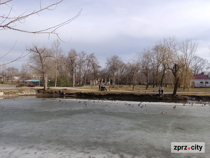 Озера парку все ще тримають крижану плівку, хоча температура вже кілька днів плюсова. Рівень води в них піднявся порівняно з осінню.