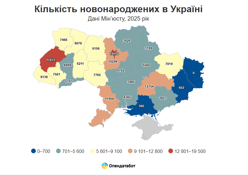 За даними Міністерства юстиції України, по всій країні у 2025 році народилося 168 778 дітей.