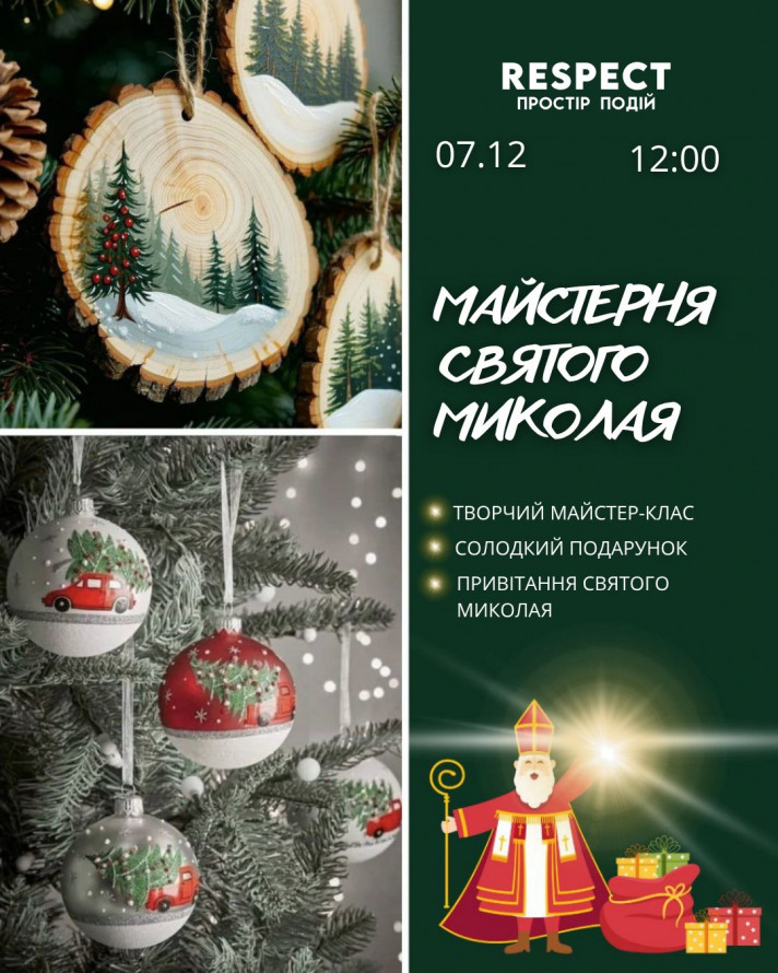- 7 грудня о 12.00 - творчий майстер-клас "Майстерня Святого Миколая": діти розфарбовують дві ялинкові іграшки, які заберуть додому як святковий декор, а також привітання від Святого Миколая. Для дітей від 5 років. У "RESPECT простір подій".
