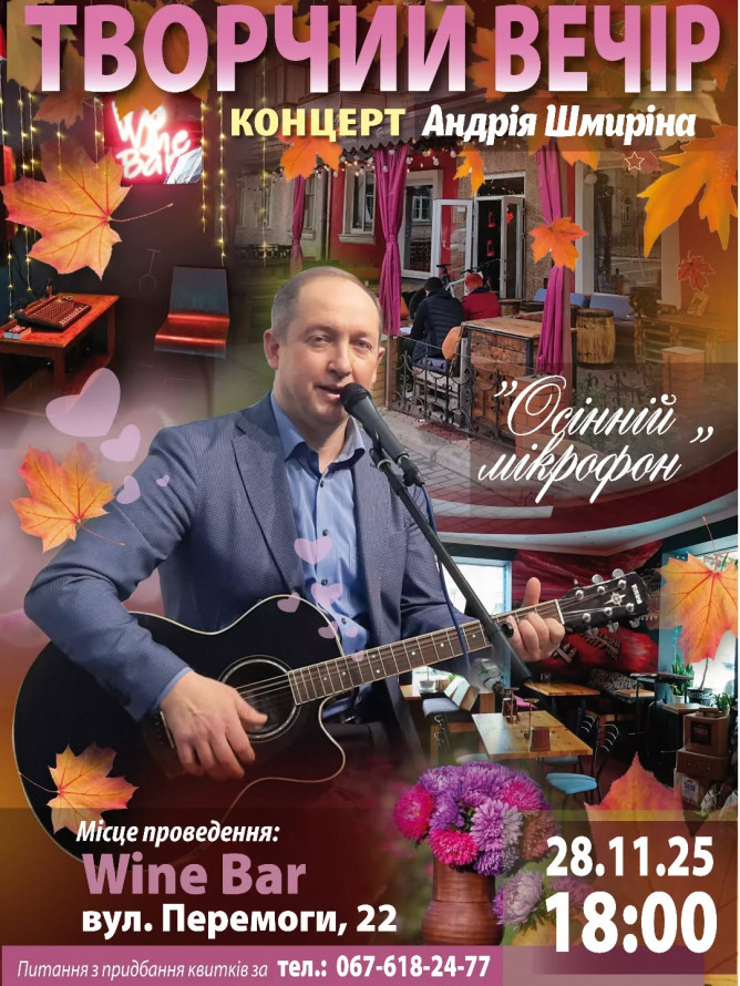 - 28 листопада о 18.00 - авторський концерт "Осінній мікрофон" барда, художника Андрфя Шмиріна (Запоріжжя).У програмі — живе звучання гітари, авторські пісні та відомі хіти у власній інтерпретації.