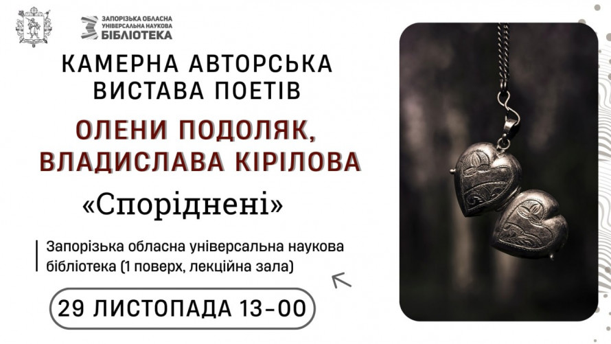 - 29 листопада 13.00 - камерна авторська вистава запорізьких поетів Олени Подоляк та Владислава Кірілова "Споріднені". Вхід вільний.