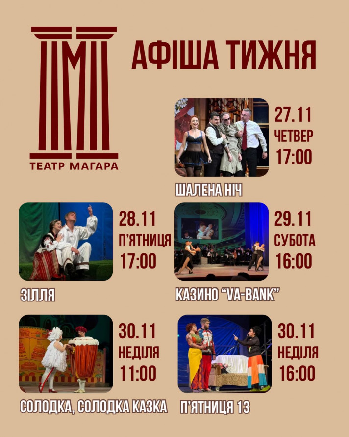- 29 і 30 листопада о 17.00 - вистава "Сім перших робіт Аліни", у Домі актора (т еатр-лабораторія "Vie" на острові Хортиця, вул. Наукового містечка, 35). 16+.