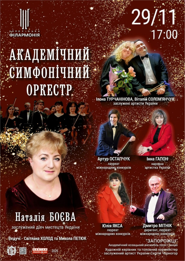 - 29 листопада о 17.00 – прем’єра концерту академічного симфонічного оркестру філармонії під керуванням лауреата міжнародних конкурсів Дмитра Мітніка. У програмі: твори запорізької композиторки, заслуженої діячки мистецтв України та членкині Національної спілки композиторів України Наталії Боєвої.